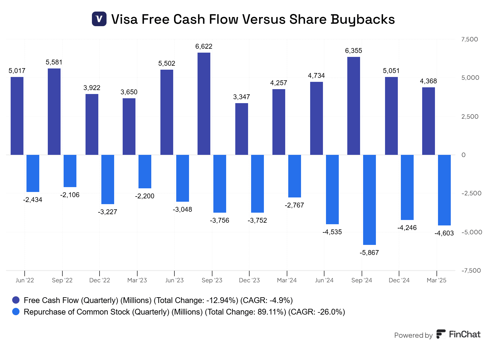 The company generated $4.37B in free cash flow on the quarter, and utilized practically all of that to buy back shares and pay out dividends. I’ve attached a chart below showing free cash flow (purple) versus share buybacks (blue).