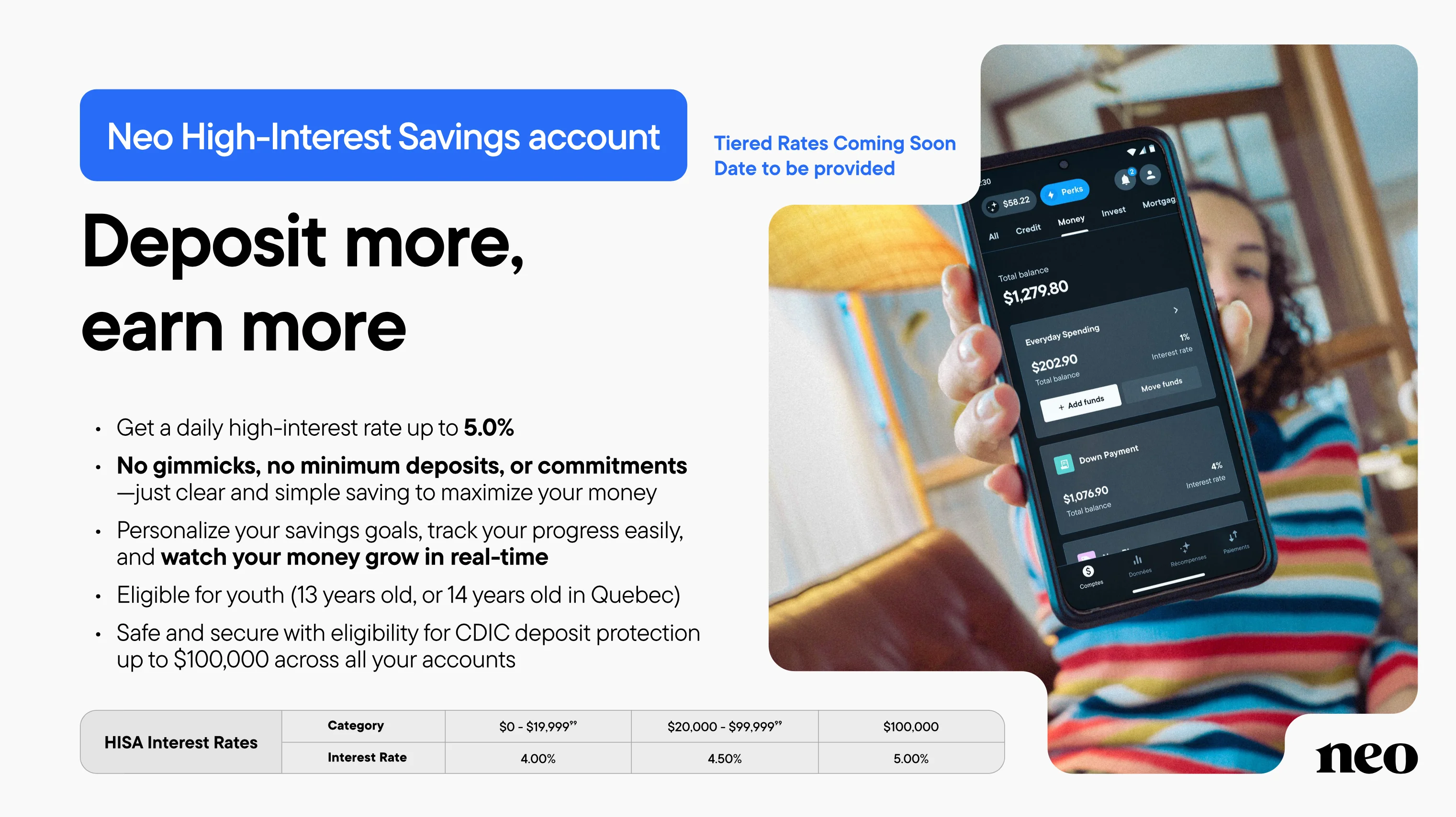 The high-interest savings account is a convenient and secure way to deposit and manage my funds. This account does not come with monthly fees or minimum deposit requirements and can be accessed through the Neo app.