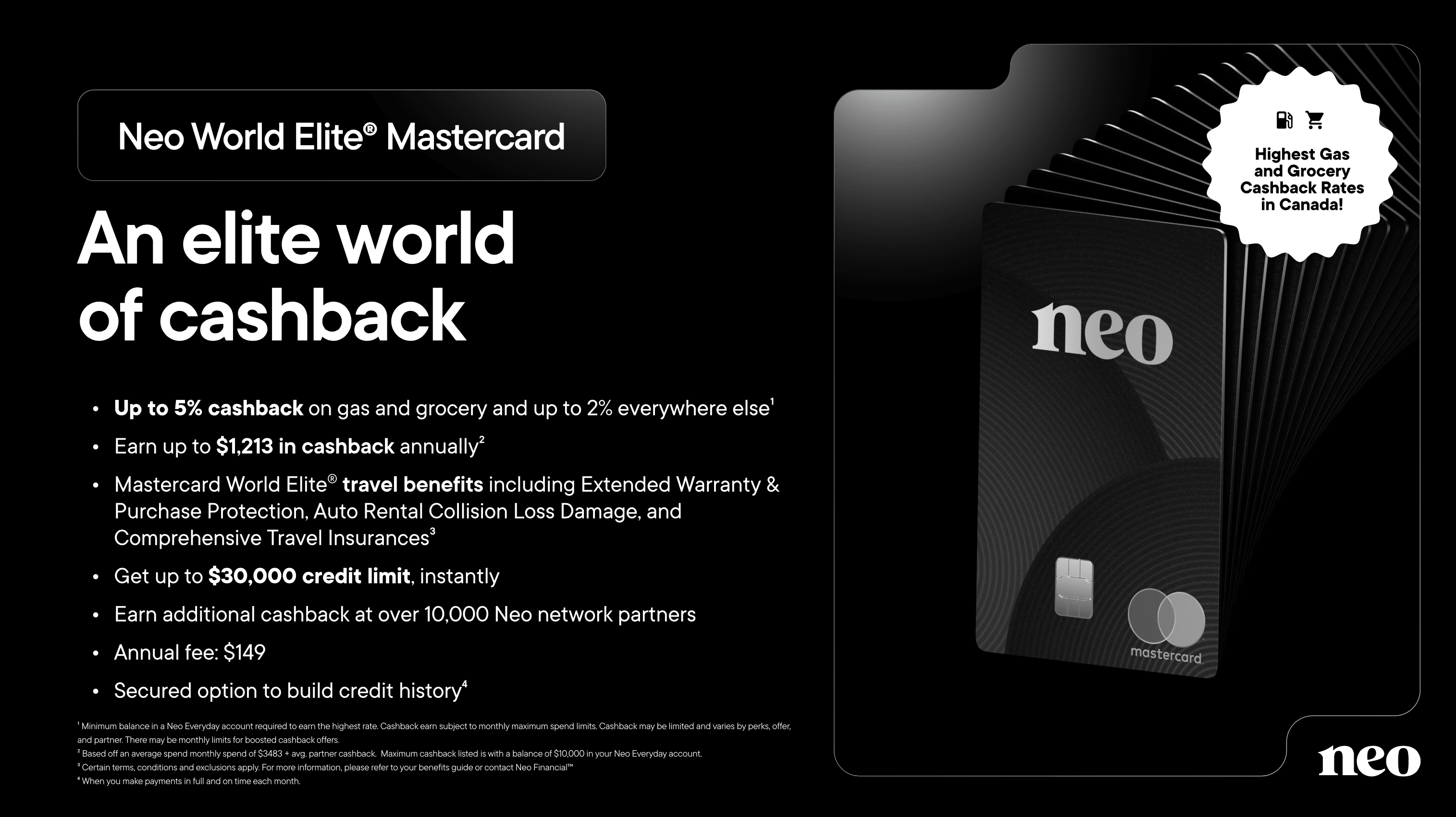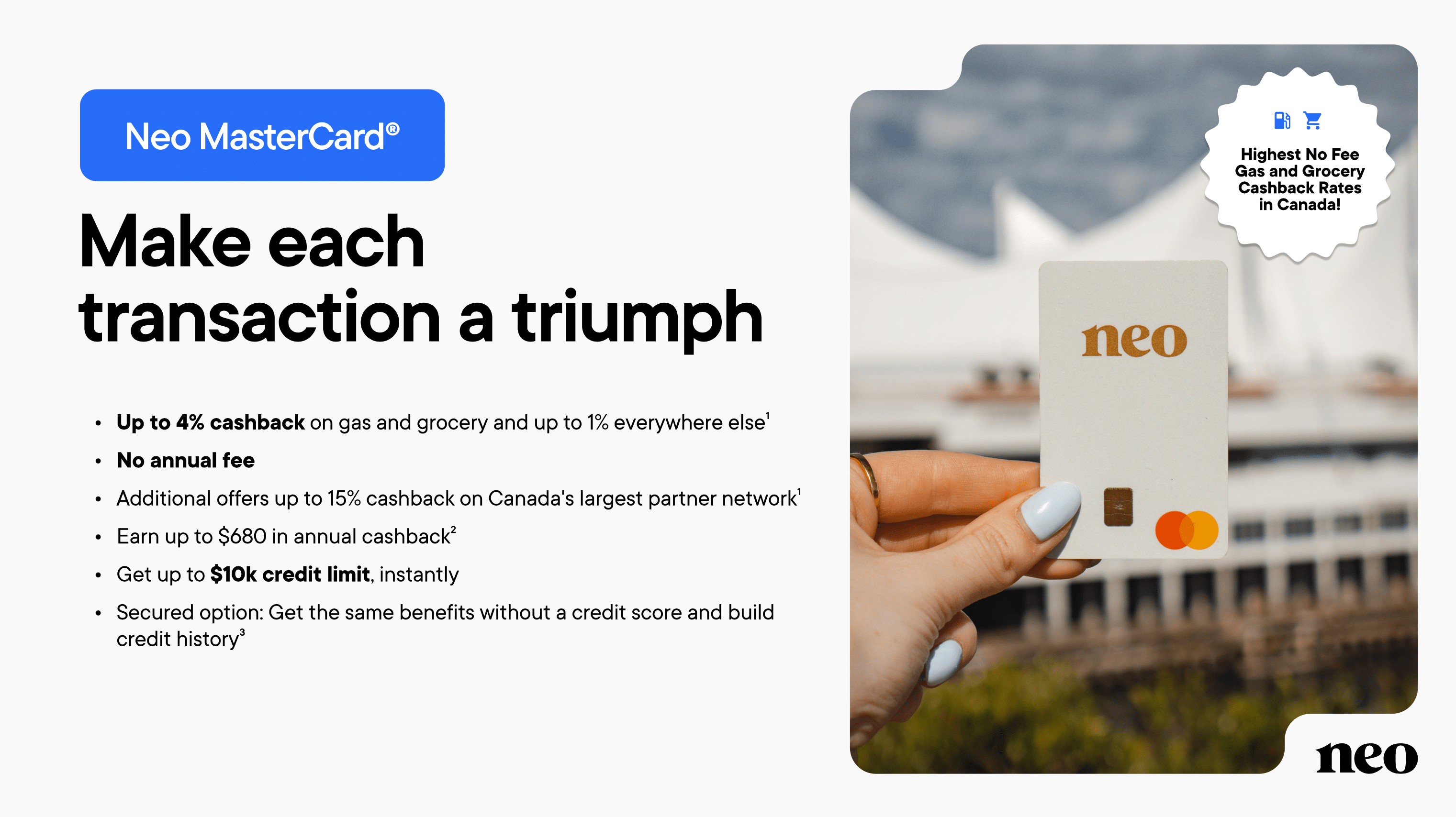 Neo Mastercard is best for our day-to-day spending. The application process is easy, the welcome offers are attractive, and the card has no annual fee, giving it a big advantage over some cash back cards offered by major institutions. It also offers some attractive incentives for everyday purchases, such as: