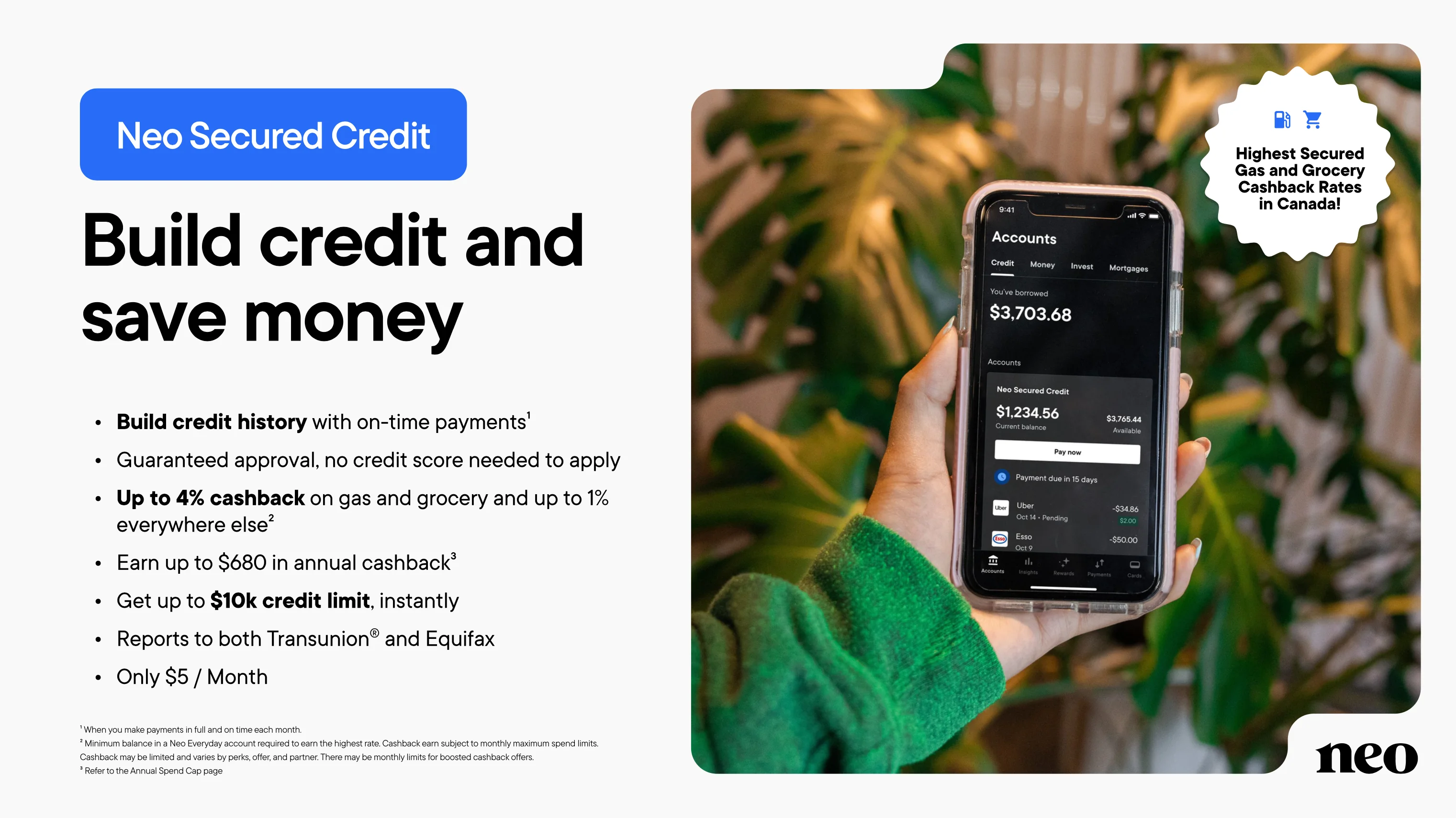 The Secured Neo Mastercard helps build a credit history and, in turn, a credit score. How does it do this? Well, it requires a deposit from the cardholder, typically up to the available credit limit. This deposit allows a person to get approved for a credit card, only spend what they have available, and build a solid credit score in the process.