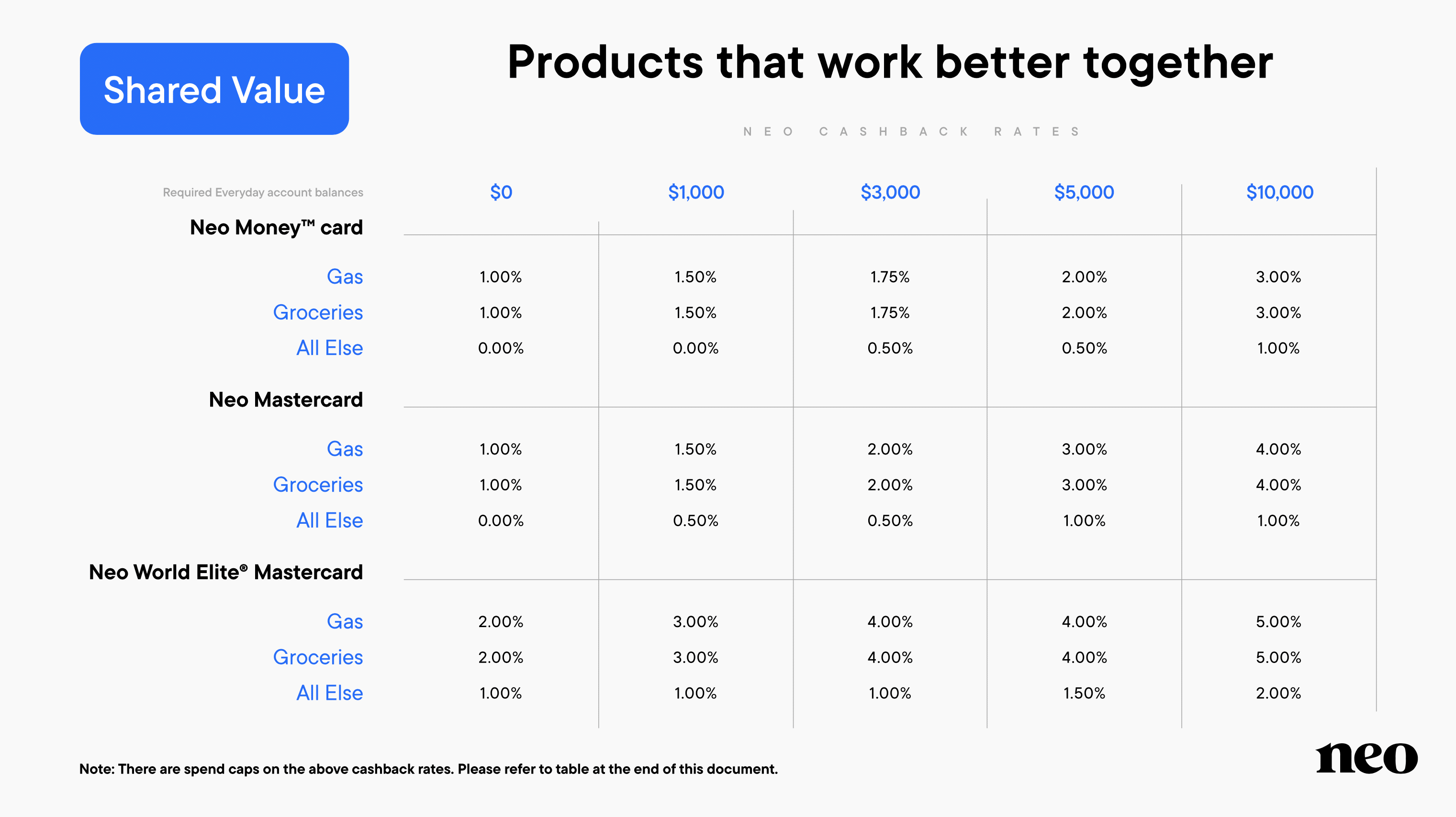 - Up to 15% cashback on first-time purchases at thousands of Neo partners.