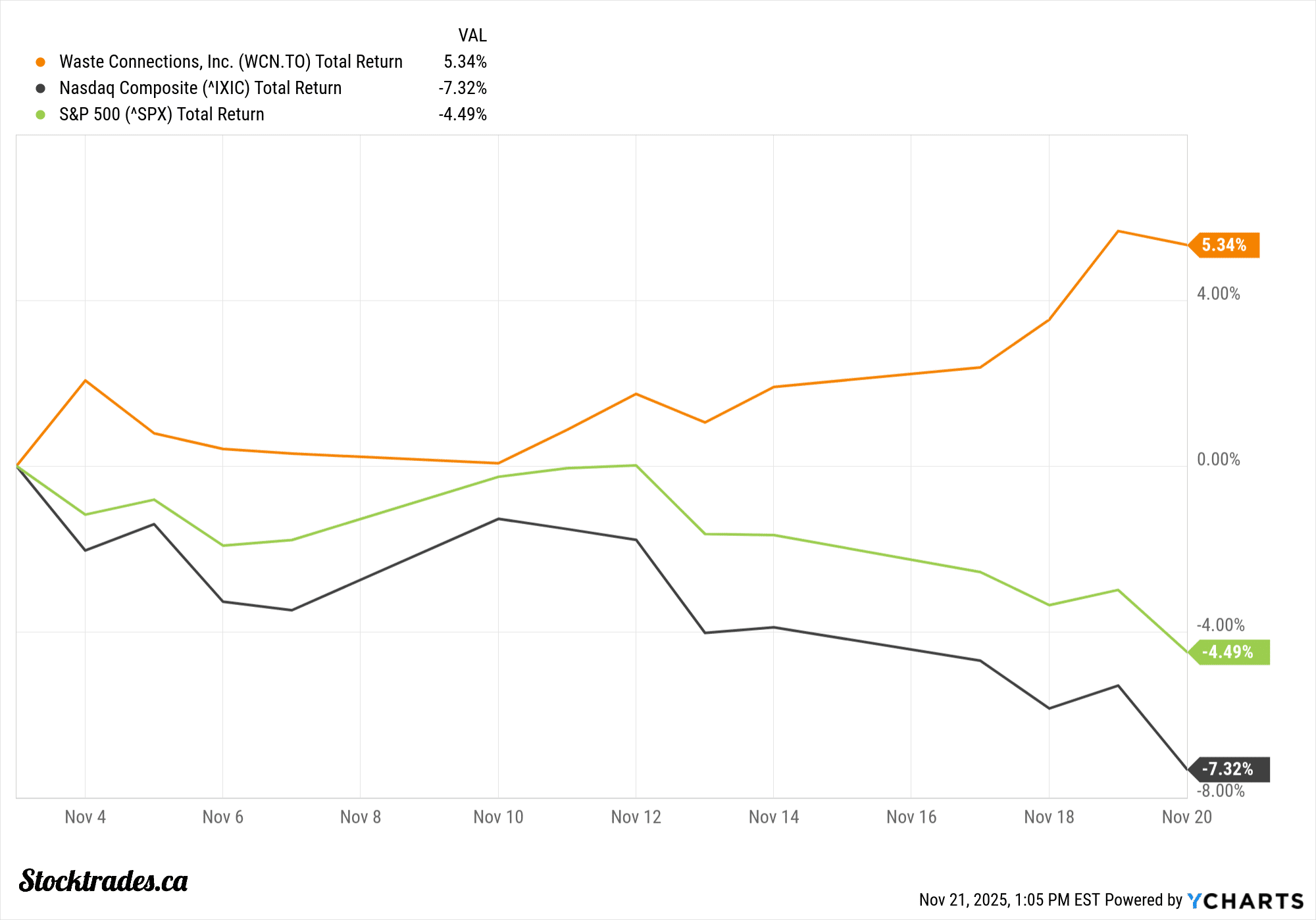 Although it’s fairly early, we’re starting to see a bit of a potential rotation out of those high-growth names and into quality, defensive compounders. In November alone, Waste Connections has outperformed the NASDAQ by 12%~.