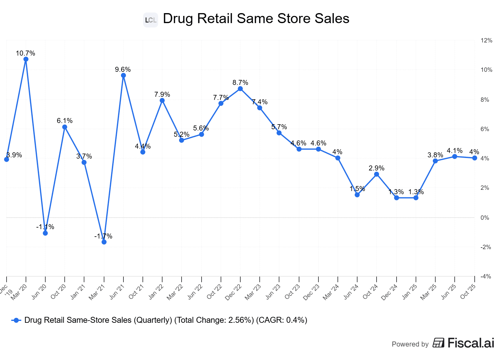 The pharmacy segment remains a clear bright spot, with same-store sales up 4% and prescriptions driving the majority of that growth.
