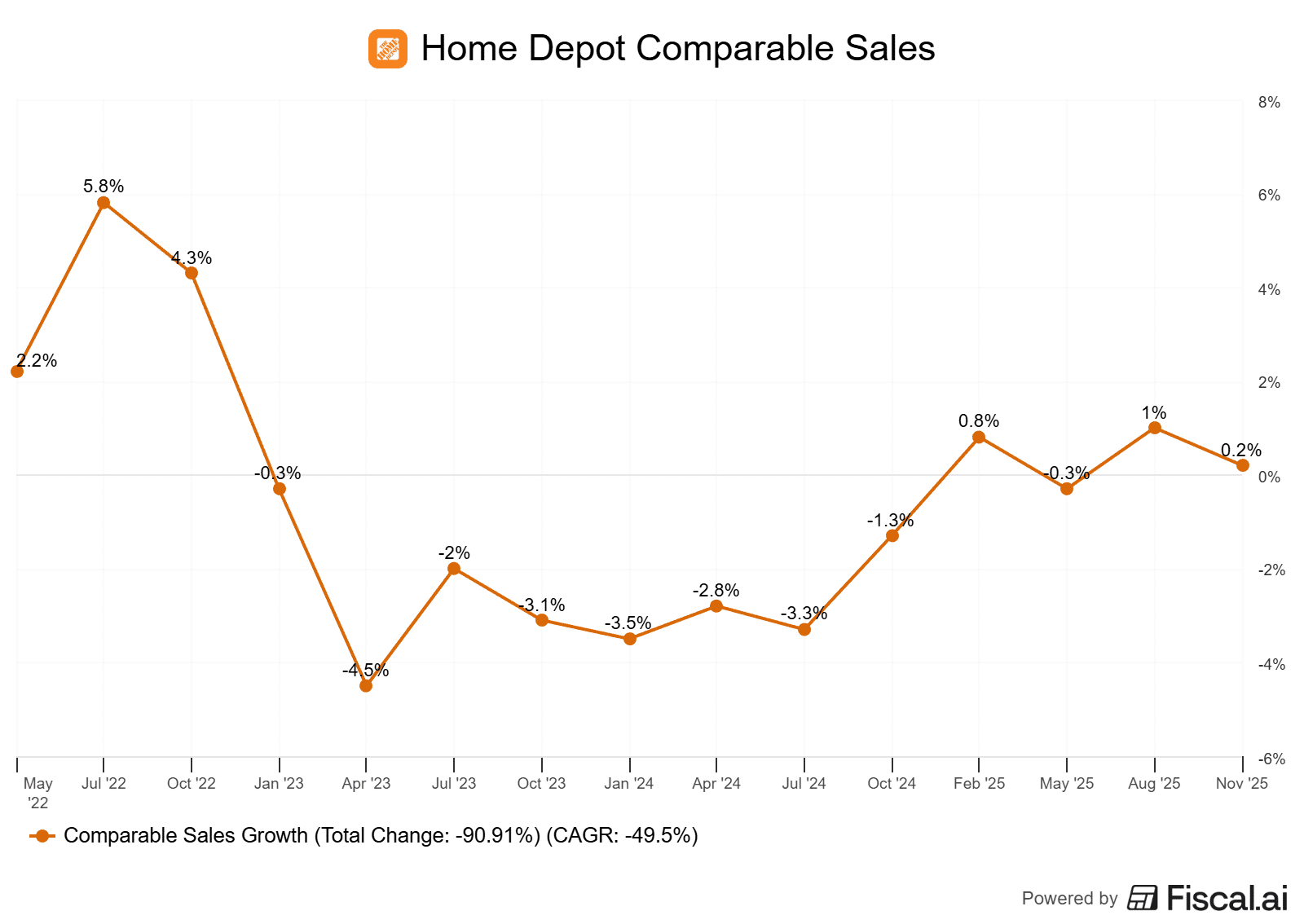 The bull case here is still intact. Home Depot is building a more durable, omnichannel, pro-oriented platform. But the economy isn’t cooperating, and investors shouldn’t expect the payoff to come in fiscal 2025. If mortgage rates ease, home turnover picks up, and pro backlogs start to rebuild, Home Depot will be positioned to do well Until then, the stock is likely to remain in a holding pattern, with investors needing to be patient as the cycle plays out.