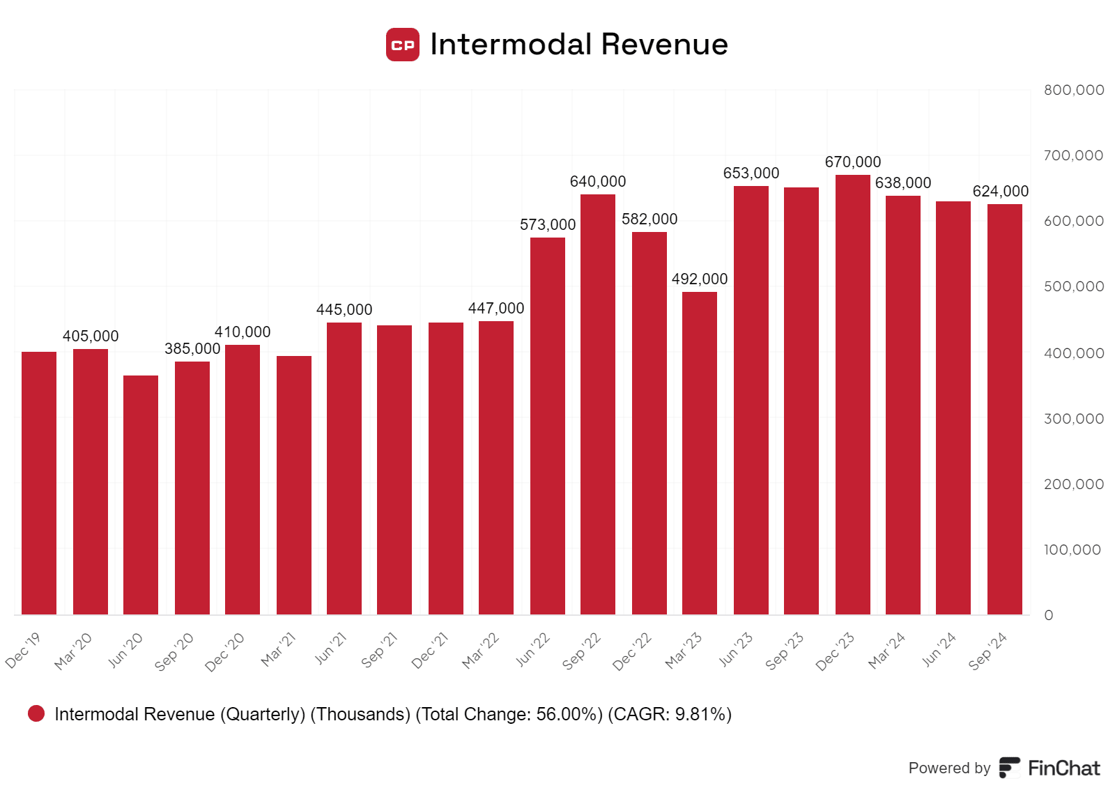 However, intermodal revenue is heavily reliant on a strong economy, and as you can tell by the chart below, this is the company’s third straight quarter of declines in this area.