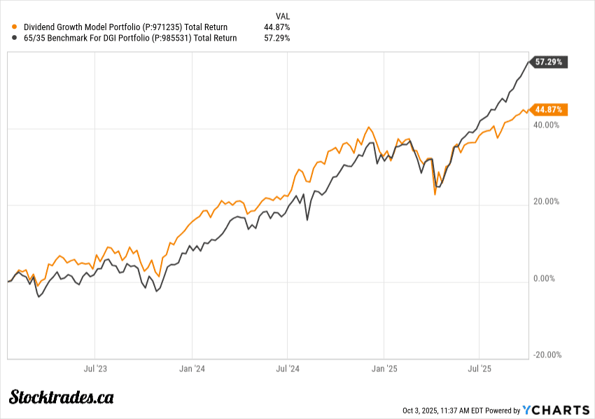 You can pretty much see the exact moment the Dividend Growth portfolio started underperforming its benchmark. That would be when the markets started recovering from the impacts of “Liberation Day” and the implementation of wide-scale tariffs.