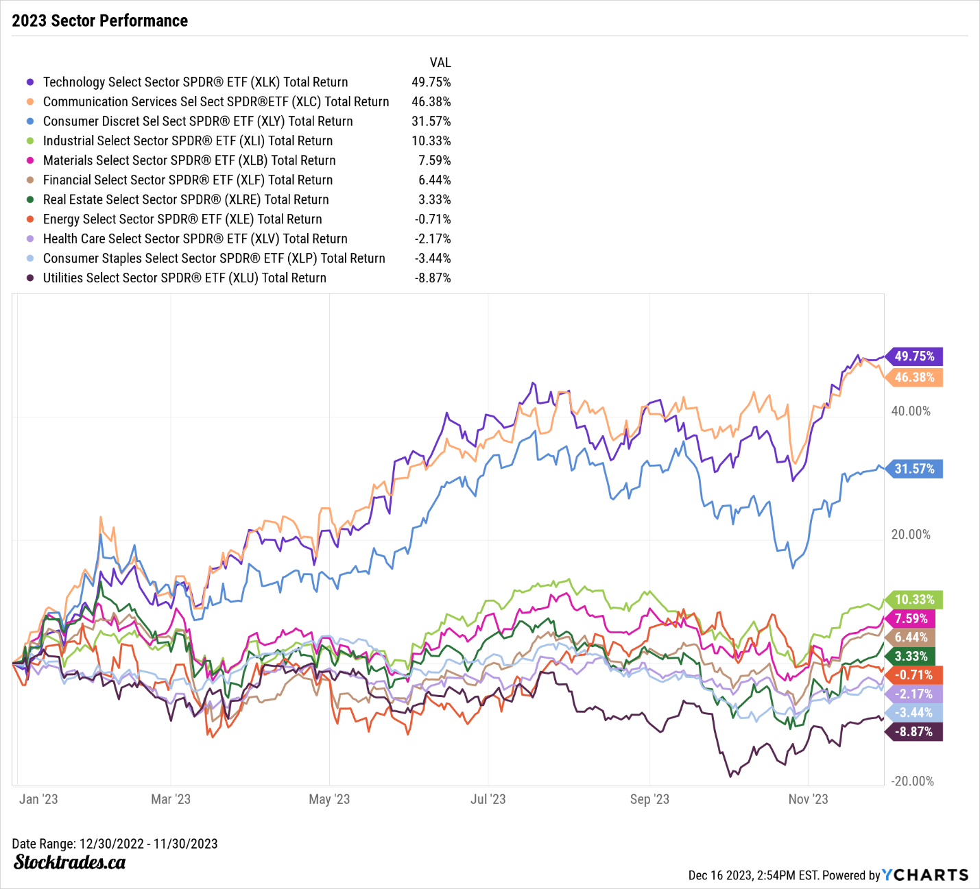 Which sectors led the charge? To no one’s surprise, technology led the way south of the border. Now, you might be surprised to see the communication sector keeping pace with tech, especially considering the difficult year among telecoms. However, it is important to remember that a few years ago, there were some changes to the sectors to ensure more balance. Some tech companies, such as Alphabet (GOOG) and Meta (META), are no longer classified as tech companies and are now considered communication companies. Considering both of those were among the Mag 7 (more on that later), it is not surprising to see that sector outperform.