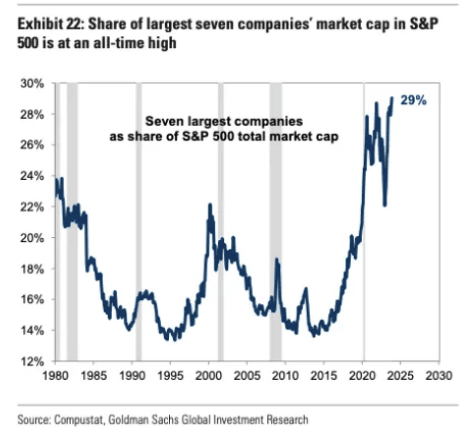 If you have been with us for the year, no doubt you will have heard us talk at some point about how the market gains owe their success in large part to a limited number of companies. To illustrate, below is a chart of the “Magnificent Seven,” sometimes referred to as the “S&P 7.” They are the 7 largest stocks by market cap in the U.S., which make up ~29% of the total market cap of all companies listed in the S&P 500. Given their size, they have a disproportionate effect on the performance of the S&P 500. In fact, their share of market cap is at an all-time high.