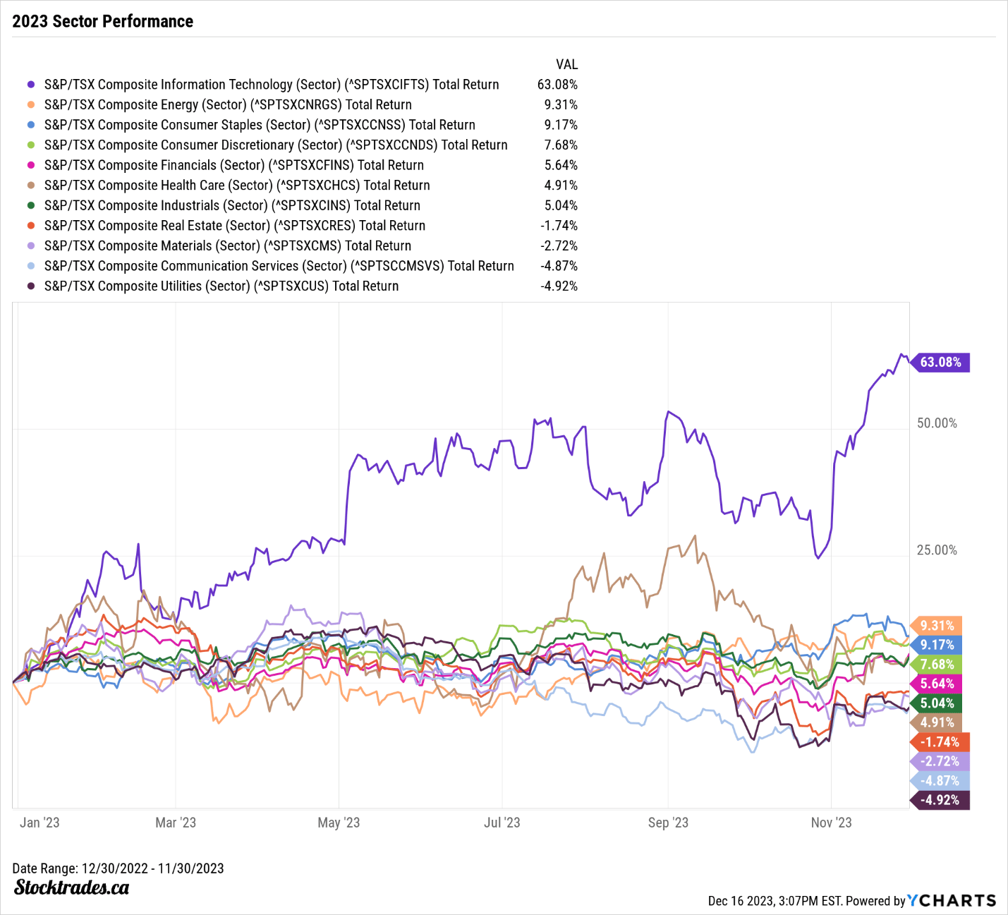 The first thing that stands out is that the technology sector obliterated every other sector significantly. It was the ONLY sector to achieve double-digit returns. On the flip side, unlike the S&P 500, the communications sector was one of the worst performing. The reason is simple: Canada’s ‘version’ of this sector is dominated by telcos, which had a tough year. Furthermore, it has few notable tech companies that made the switch from the technology sector. Not surprisingly, the worst-performing sector was once again utilities.
