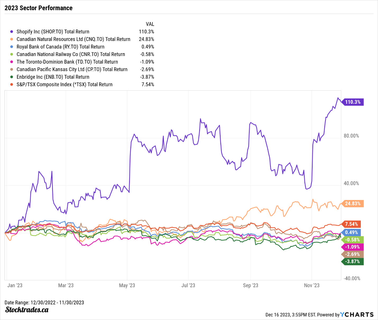 As you can see, if it wasn’t for Shopify (the lone tech stock among the Canadian Mag 7) and Canadian Natural propping up the Index and materially outperforming, it would have likely been an underwhelming year for the S&P TSX Composite Index, which is sitting on 7.54% gains on the year.