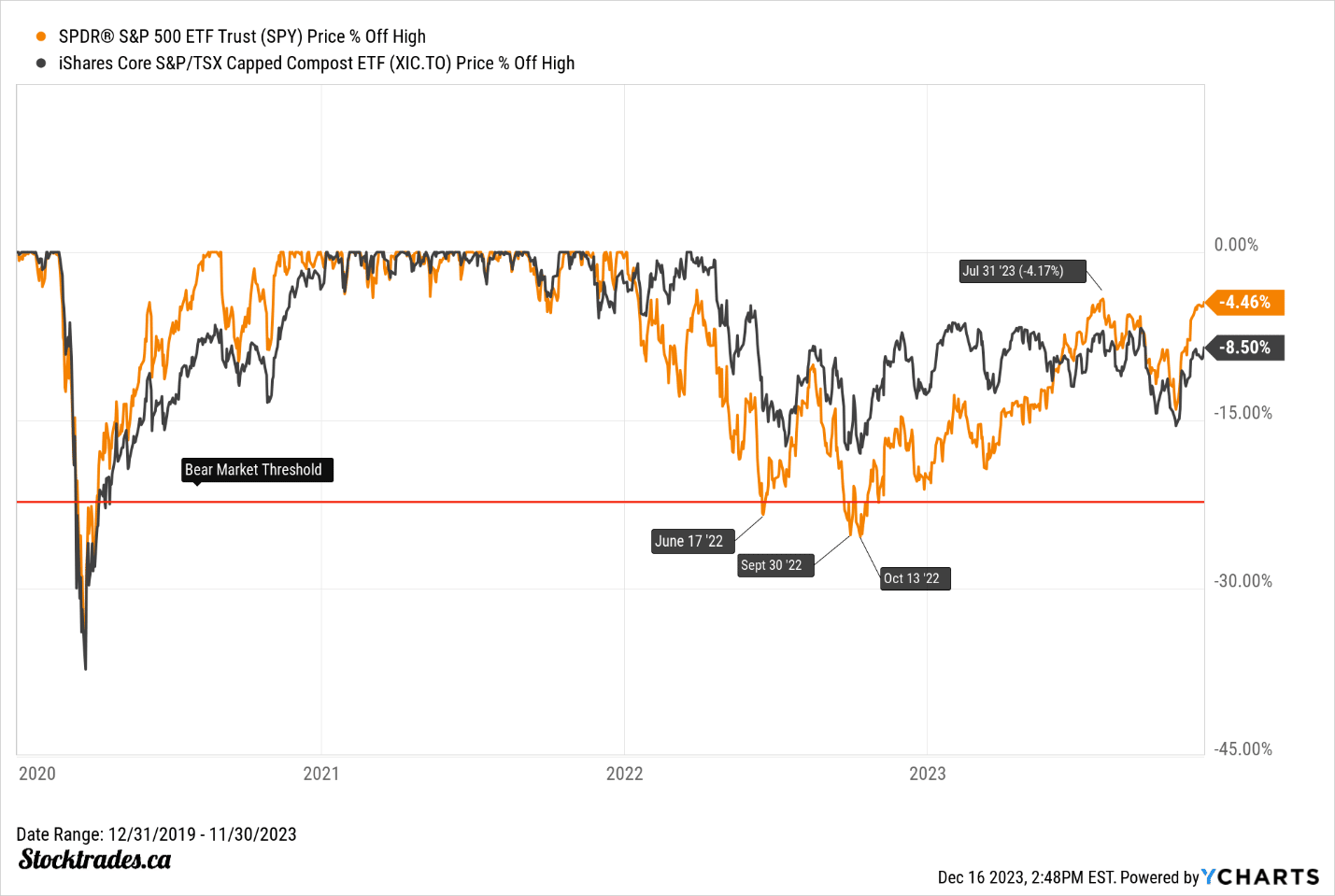 As a starting point, it felt like a difficult year in the market, given the rollercoaster of a ride. That said, we can now say that the U.S. and Canadian indices are out of bear market territory. A bear market is traditionally defined as a 20% drawdown. If you look at the chart below, you’ll see that we exited bear territory and are within striking distance of all-time highs. One look at the chart below, and you’ll also notice that the TSX Composite Index has been far more volatile this year, with several peaks and valleys. Only recently has the S&P 500 begun outperforming the TSX, largely due to the pullback in energy stocks.