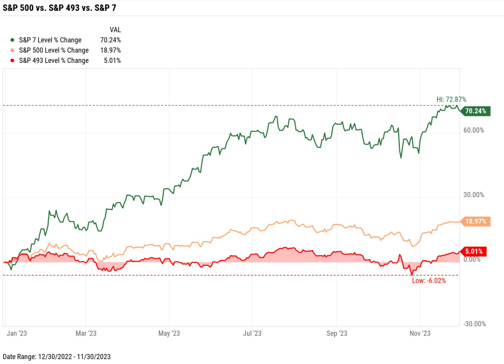The Mag 7, comprised of Apple (AAPL), Amazon.com (AMZN), Alphabet (GOOG, GOOGL), Meta Platforms (META), Microsoft (MSFT), NVIDIA (NVDA), and Tesla (TSLA), are up a staggering 70.2% through the first 11 months of the year as a collective on a market-cap weighted basis. Meanwhile, the remaining “S&P 493” is only 5% higher and has been negative at various times since the start of the year.