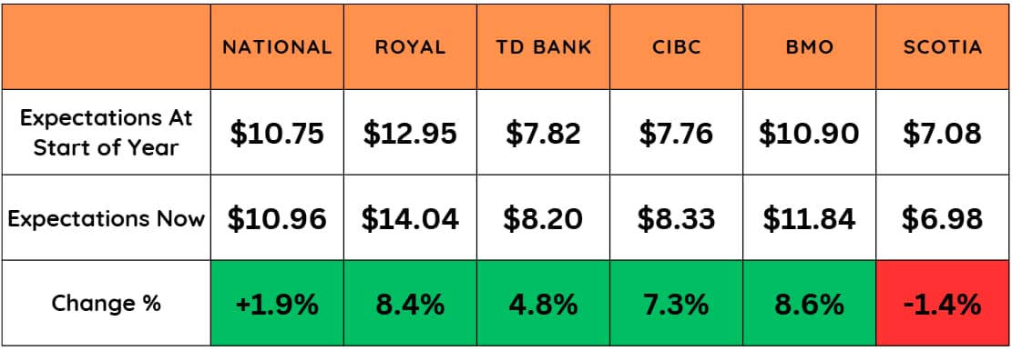 What you will notice now is that pretty much every bank outside of Scotia has had some notable upgrades to earnings over the course of the year, with Royal and BMO being the largest.