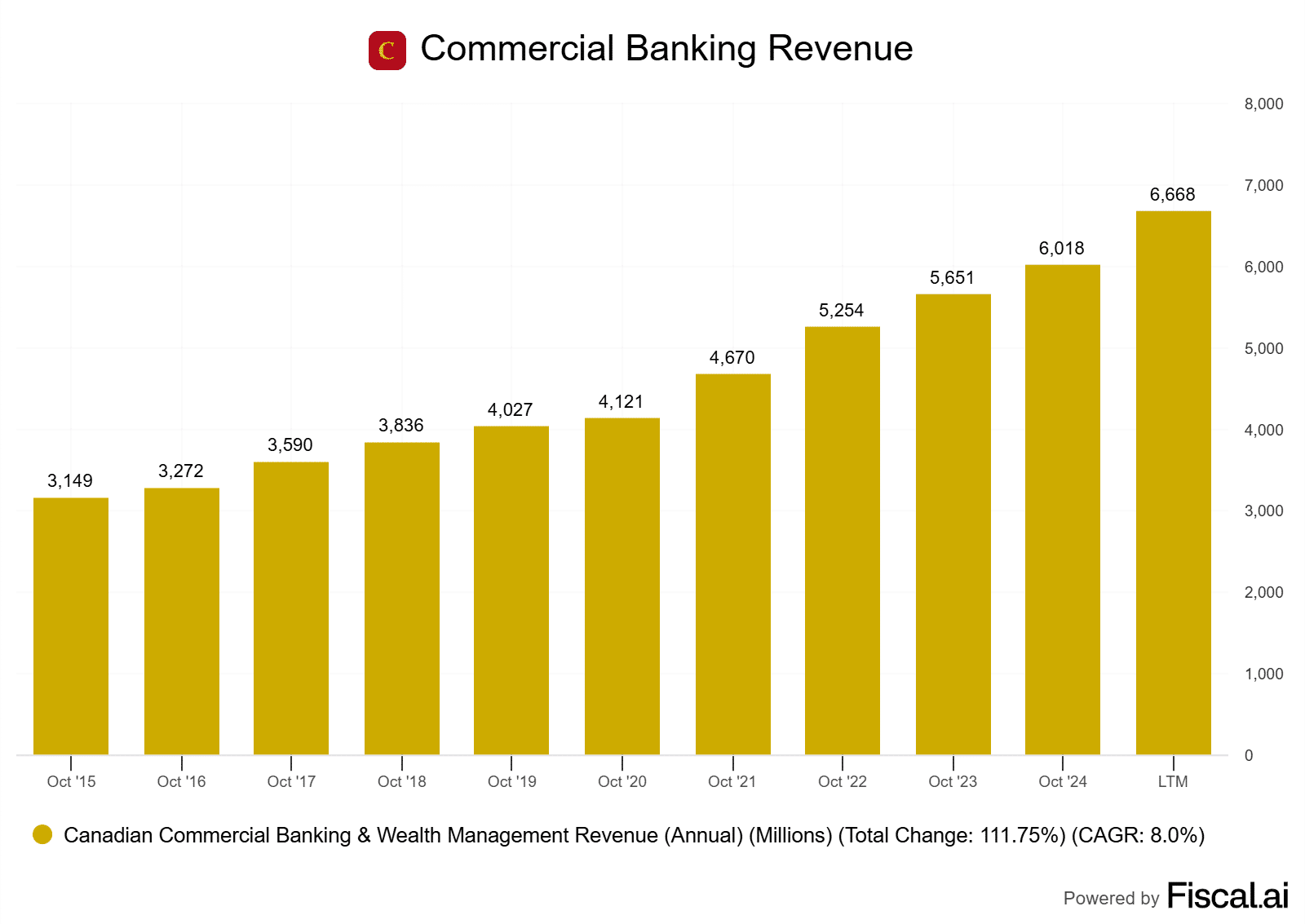 Commercial banking revenue increased by 10% and net income by 19%. The only difficulty here is CIBC does bundle Wealth Management inside this segment, which no doubt helped fuel larger earnings growth. But overall, loans are up 10% and deposits are up 8% on the commercial side.
