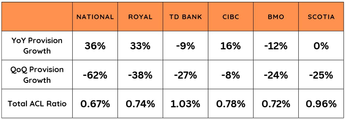 If you’re wondering why National had such a steep decline on a QoQ basis but a large increase year-over-year, a lot of the provisions from last quarter were because of its acquisition of Canadian Western.