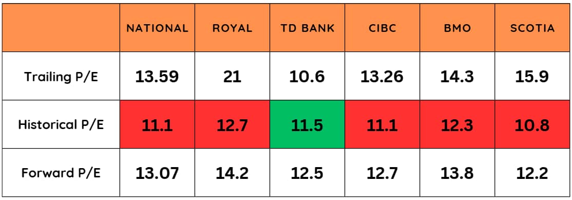 The banks have had an outstanding year, and there is zero question they are on the expensive side of things. If you look to the chart above, you’ll notice that only Toronto Dominion is trading at a discount to its historical price-to-earnings ratio.