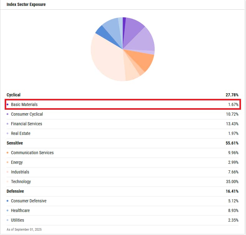 This is not all that surprising. Basic materials, which include gold, silver, and other precious metal miners, are the third-largest allocation on the index. See the chart below.