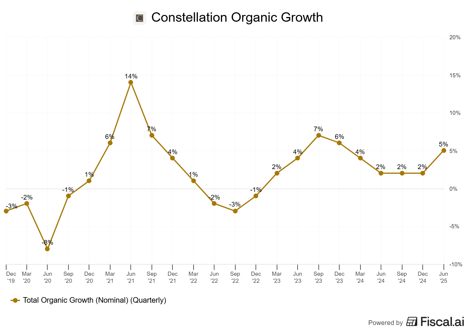As you can tell by the chart below, Constellation has little organic growth. Once it acquires companies, it will typically only generate anywhere from 4-5% annual growth organically. The thesis around Constellation lies deep within the company’s ability to acquire businesses. When you consider the fact the company has grown free cash flow per share by 20%~ annually, nearly 75% of that growth is coming from new busineses.
