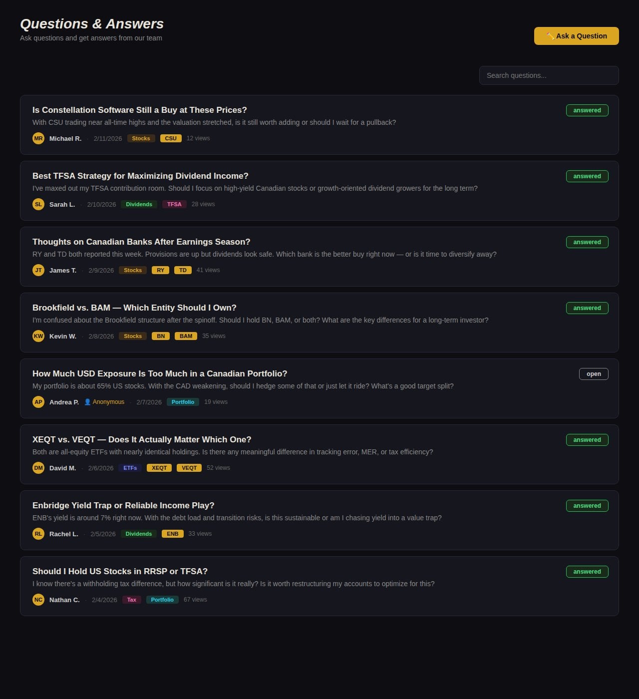 It's 2,000+ Canadian investors having real conversations. Earnings reactions, "what do you think of this one?" debates, portfolio gut checks, market news. Dan and the team are in there daily. No spam, no meme stocks, no nonsense.